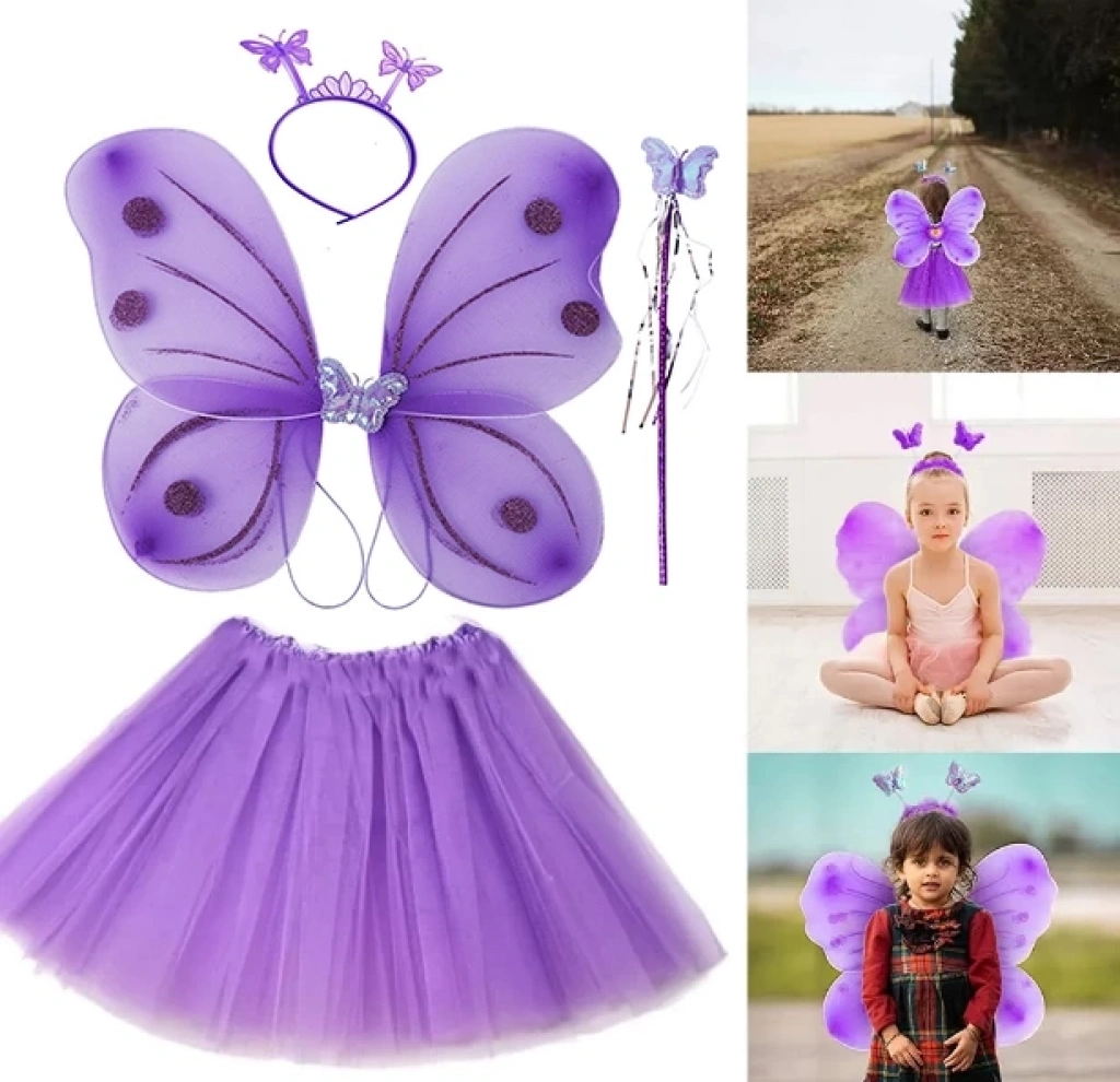 • Lila Mor Kelebek Kostümü - Lila Mor Kelebek Kostüm Aksesuar Seti 4 Parça