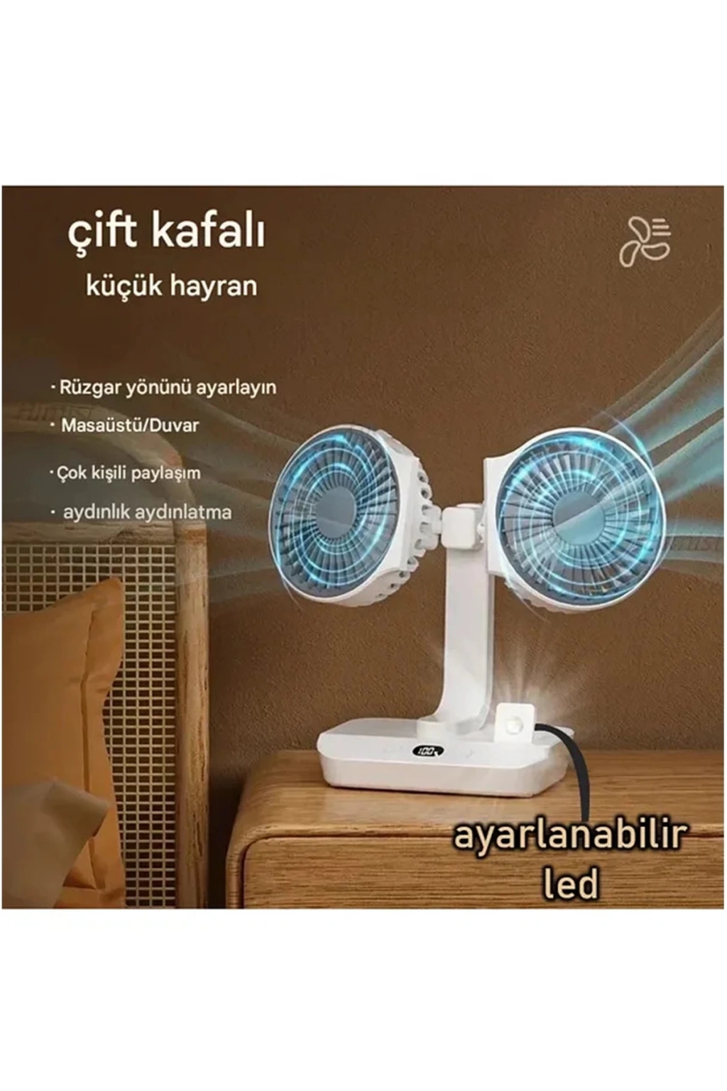 • Masaüstü Dijital Ekranlı Çift Fanlı Led Işıklı Soğutucu Fan Ev Ofis Şarjlı Vantilatör