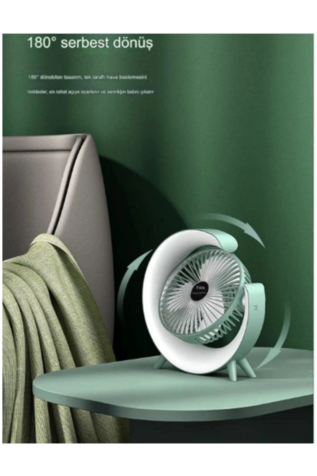 1800mAh bataryası ile USB üzerinden kolayca şarj edilebilen bu fan, kablosuz kullanım imkanı sunar.