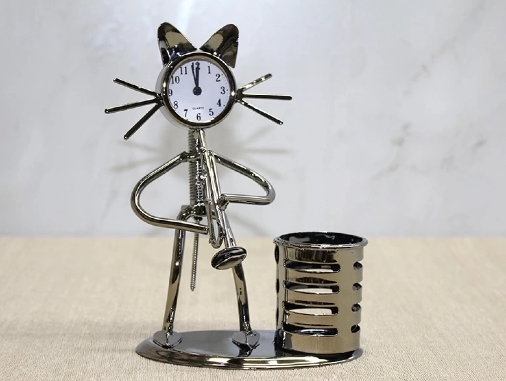• Metal Saksafon Çalan Kedi Müzisyen Saat Ve Kalemlik Alk4346