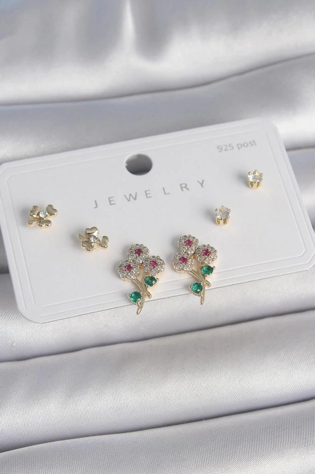 Pirinç Gold Renk Renkli Zirkon Taşlı Çiçek Model Yaprak Detay 925 Ayar Gümüş Çivi Kadın Küpe Seti - BKP10486 (599599)