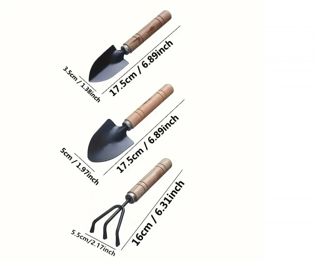 3 parça mini bahçe alet seti, tohum ekmek, sukulentler ve saksı malzemeleri için ahşap saplı çiçek tırmığı ve küçük kürek.