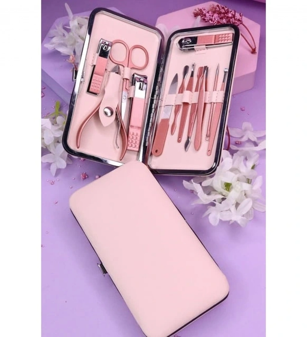 12 Parça Tam Donanımlı Set: Tırnak makası, et pensi, törpü, cımbız, kütikül itici ve diğer bakım aparatları.
