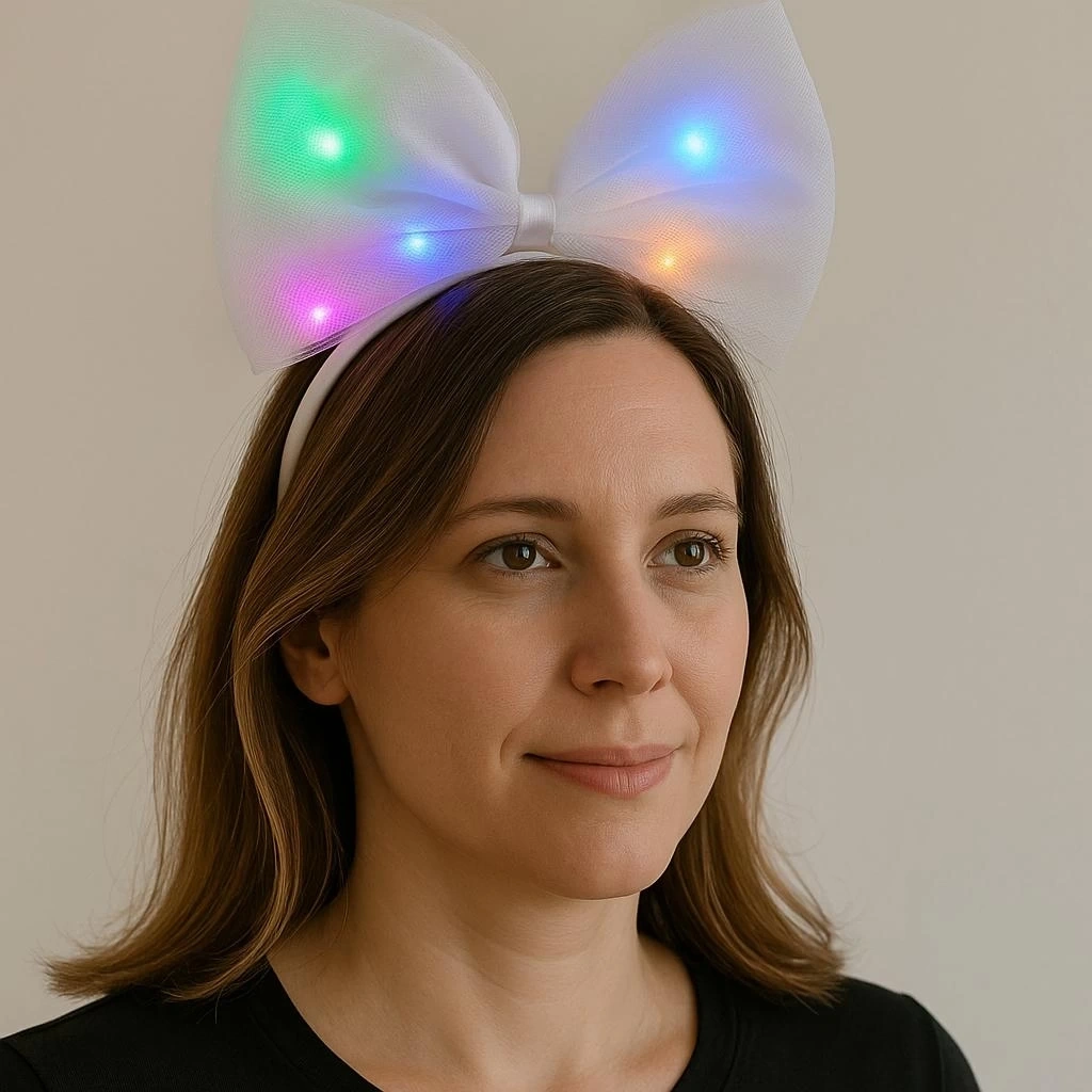 Bu güzel tül parti tacı, her partiye veya özel vesileye renk katmak için mükemmeldir. Tacın beyaz fiyonk şekli ve rengarenk LED ışıkları onu göz alıcı bir aksesuar haline getirir. 25x25 cm boyutlarındadır ve çoğu yetişkin ve çocuğa uygundur.