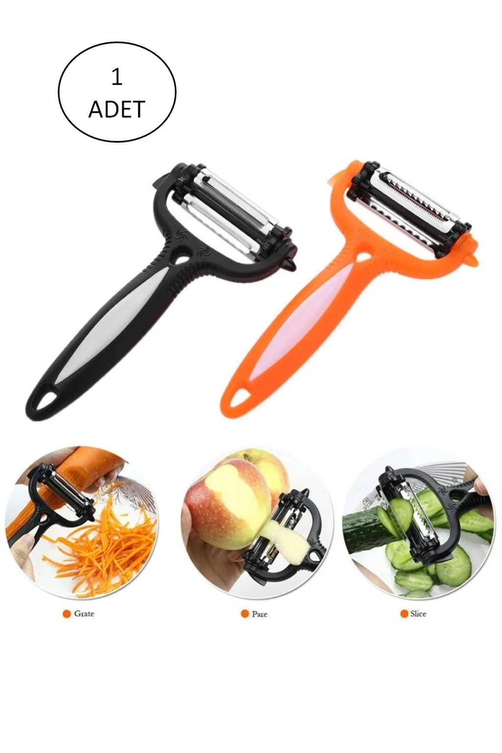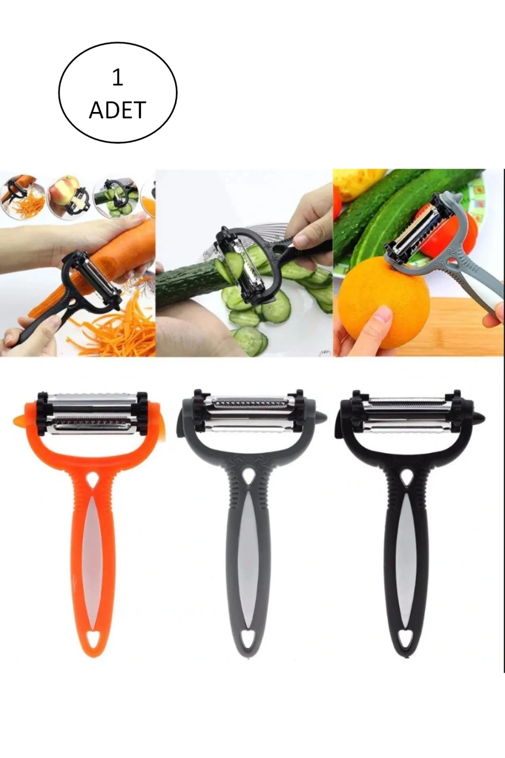 Bu 3 başlı soyacak, çeşitli mutfak ihtiyaçlarınızı karşılamak için tasarlanmıştır. İnce kabuklu meyveler ve sebzeler için ince bıçağı,
