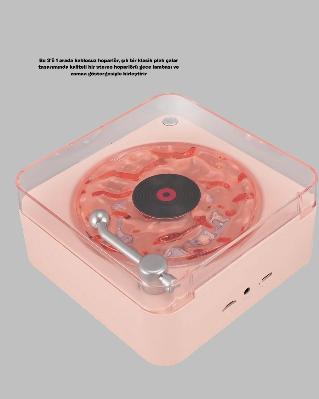 Şık retro tasarımıyla dikkat çeken bu hoparlör, teknolojiyi klasik tarzla birleştirir. Stereo ses sistemi, kristal netliğinde müzik keyfi sunarken gece ışığı özelliğiyle huzurlu bir atmosfer sağlar. Dijital zaman ve pil göstergesi, günlük kullanımda kolaylık sağlar. Kompakt boyutuna rağmen güçlü ses çıkışıyla fark yaratır. Sevimli plak çalar tarzı, her ortama uyum sağlar ve özel günler için zarif bir hediye alternatifi oluşturur.