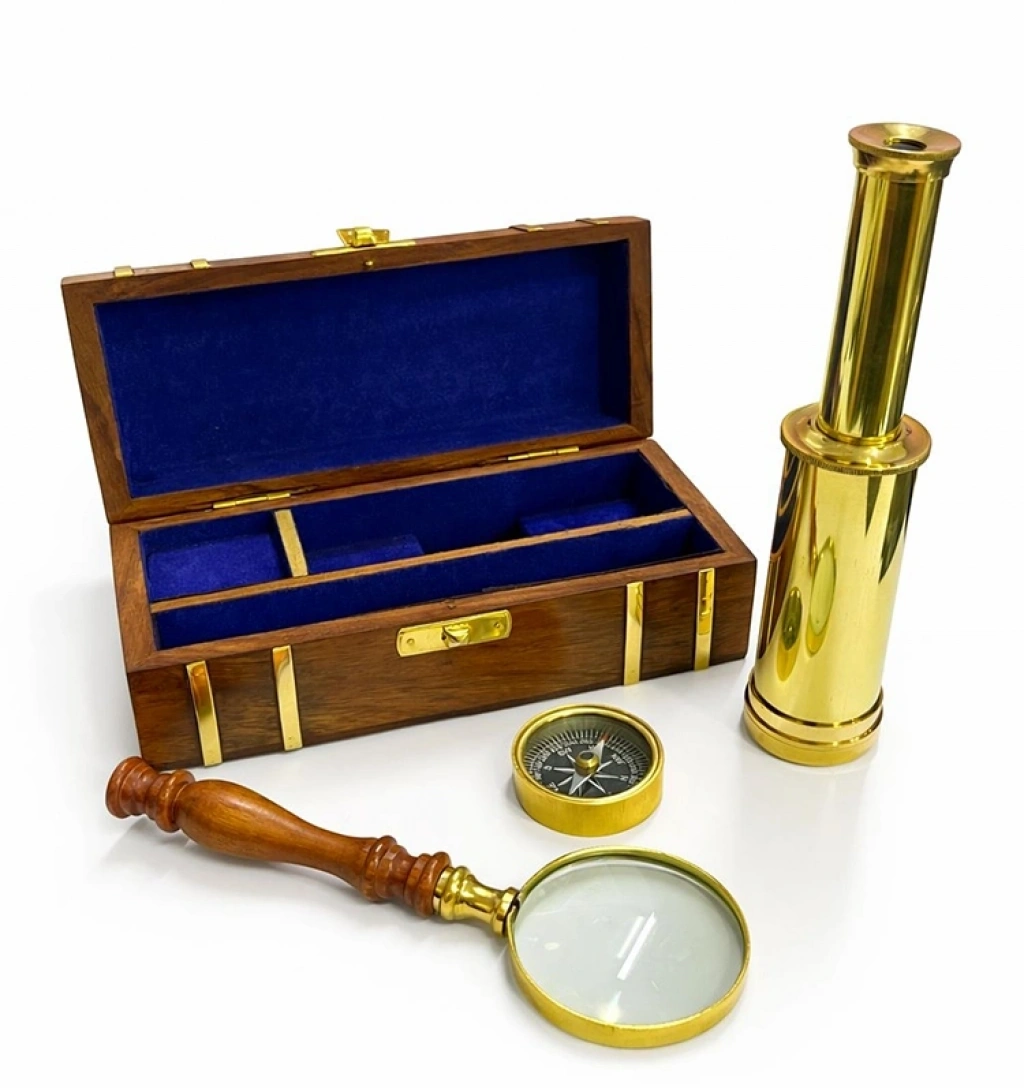 Ahşap Kutulu Pirinç Dürbün,pusula,büyüteç Seti 15304