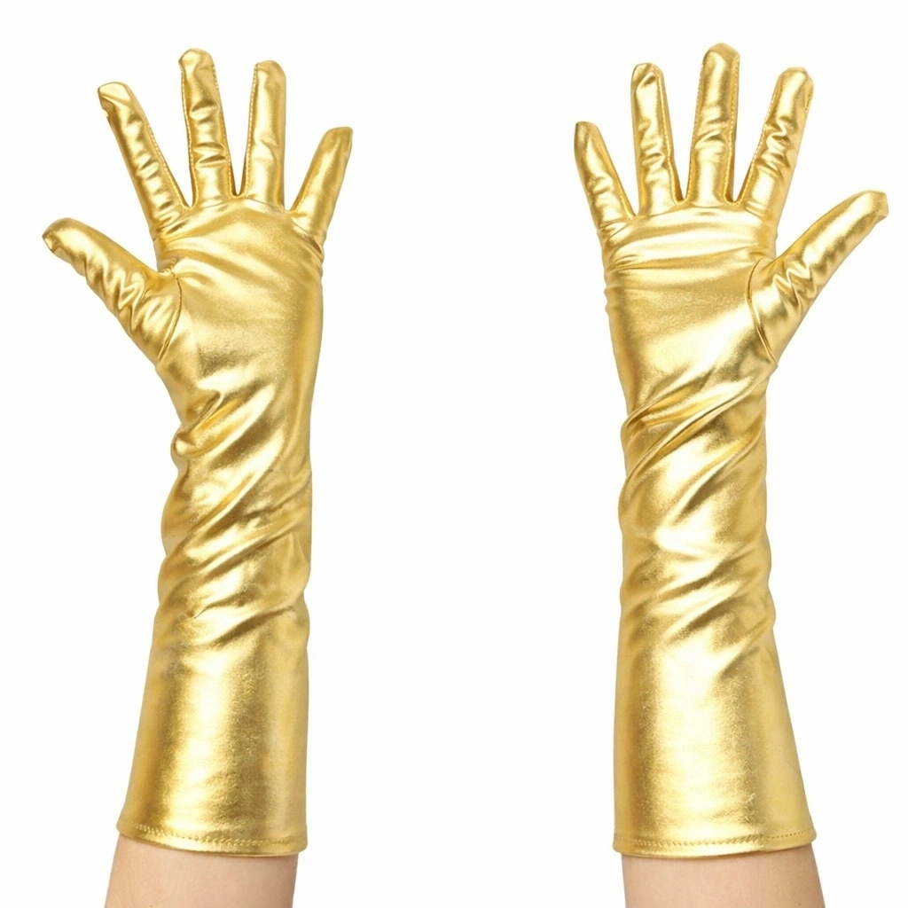 Şık ve dikkat çekici tasarımıyla 40 cm altın saten eldiven, dirsek altına kadar uzanan yapısıyla kostüm ve sahne kombinlerinin vazgeçilmez tamamlayıcısıdır. Parlak saten kumaşı sayesinde ışığı yansıtarak göz alıcı bir görünüm sunar.