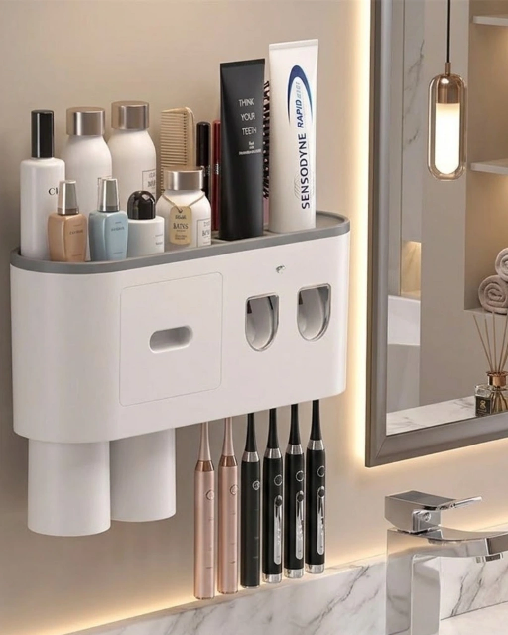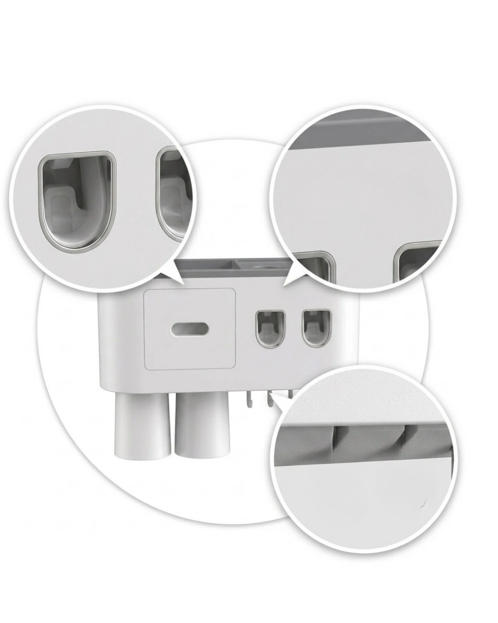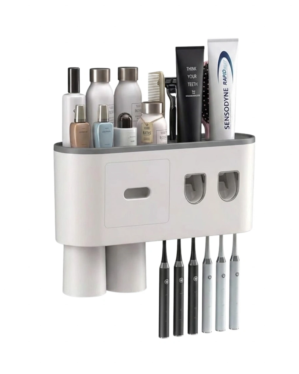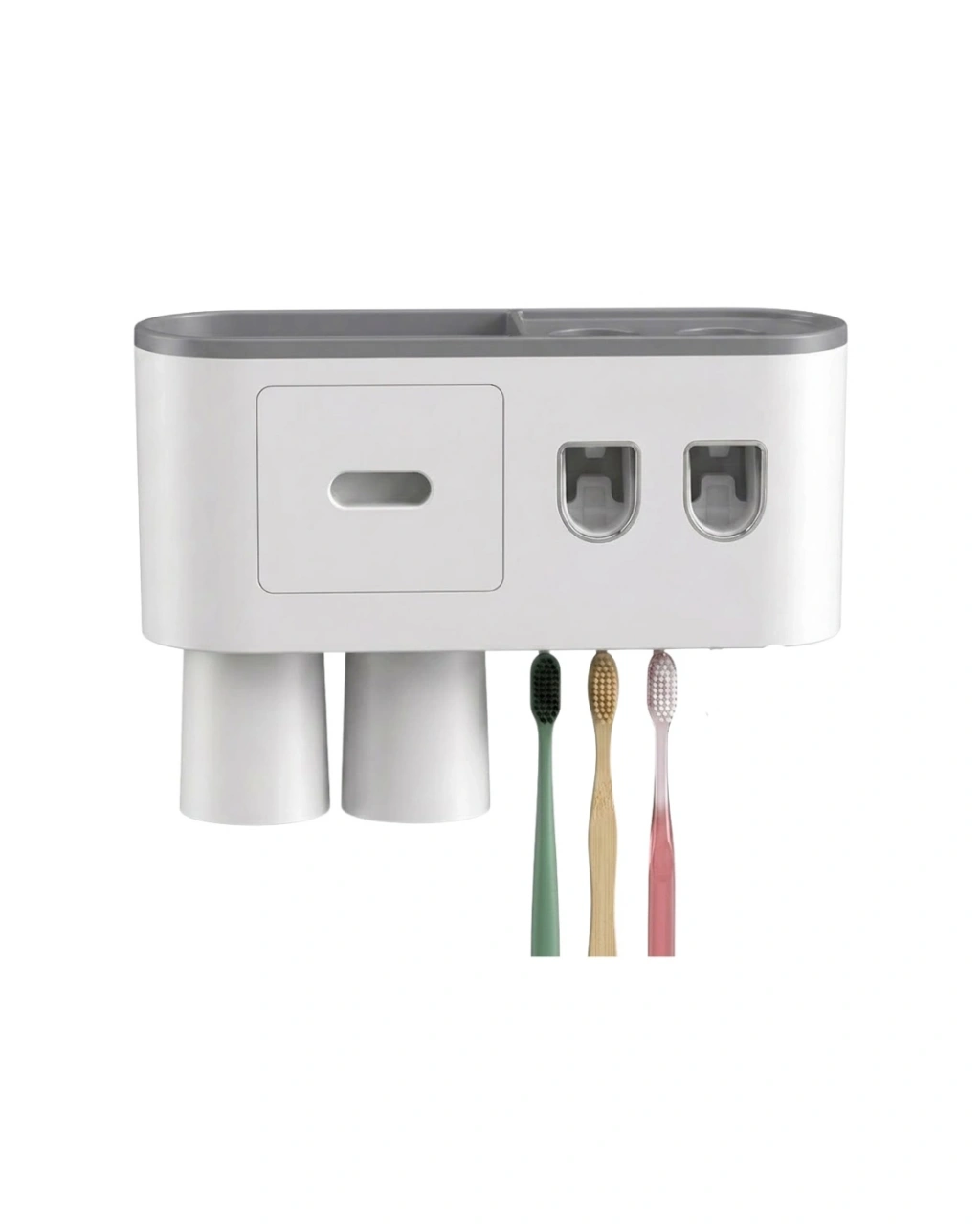 Duvara monte banyo düzenleyici, yerden tasarruf sağlayarak düzenli bir kullanım sunar. Otomatik diş unu dispenseri sayesinde kullanım kolaylığı sağlar. Çift hazneli yapısı ile iki farklı diş unu kullanılabilir.Ters bardak sistemi, hijyenik kullanım sunar. 6 diş fırçası yuvası ile geniş kapasite sağlar. Üst raf ve çekmece alanı sayesinde farklı ürünler kolayca saklanabilir.Dayanıklı malzemesi ve modern tasarımı ile uzun ömürlü ve es bir üründür.