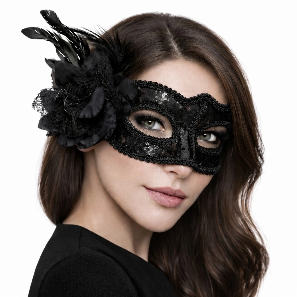 • Siyah Venedik Parti Maskesi – Çiçekli Tüylü Payetli