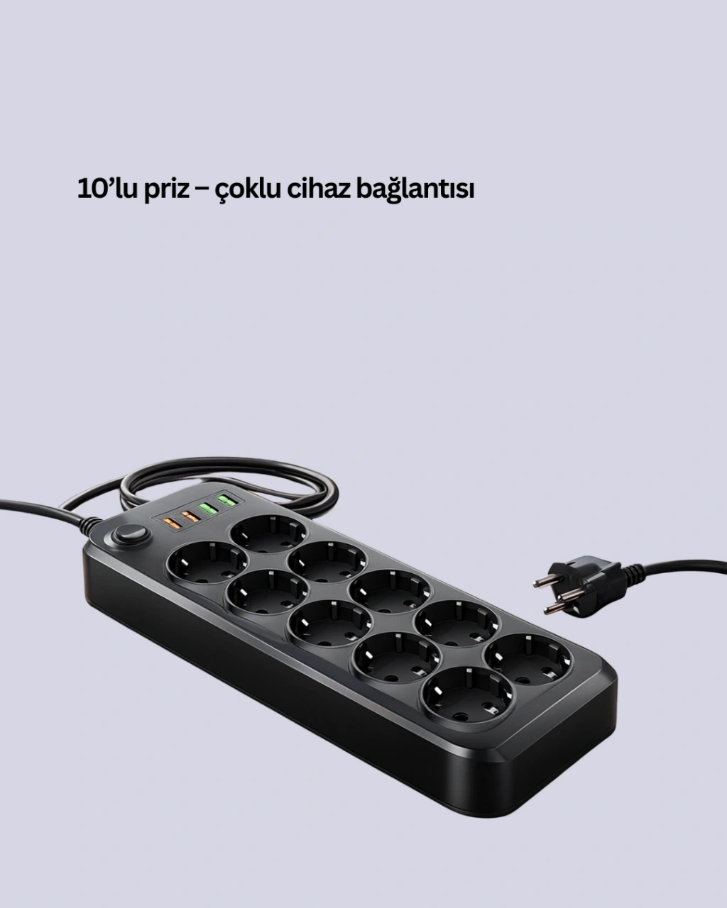 • Termal Akım Korumalı 10’lu Grup Priz USB Type-C Hızlı Şarj 2500W 2m Kablo