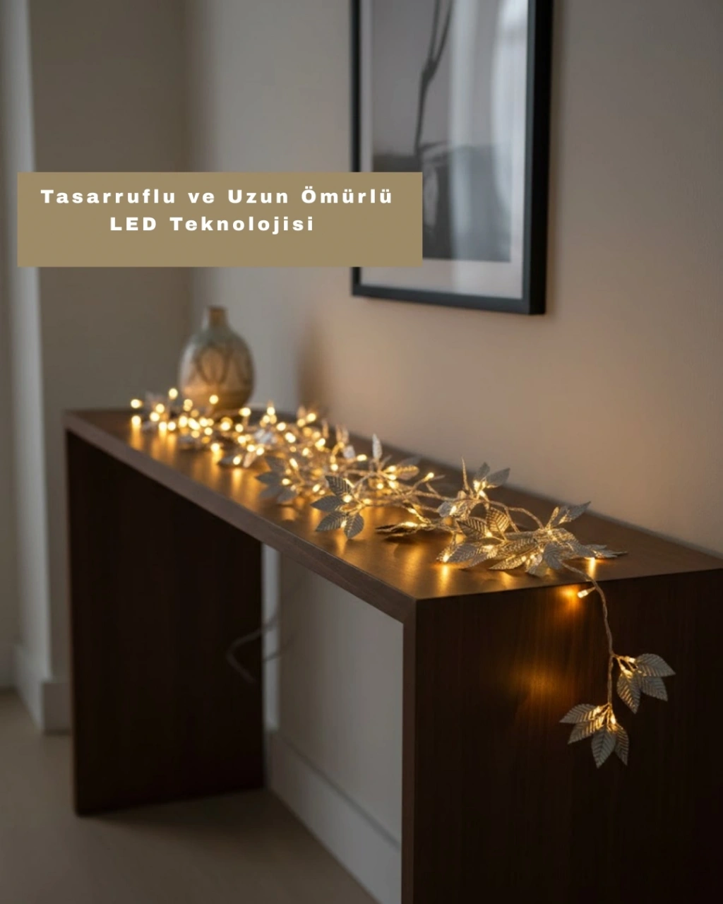 Gümüş yaldızlı yaprak LED ışık, dekoratif aydınlatmada sade ama etkili bir görünüm sunar. Yaprak formundaki detaylar, ürüne doğal bir es kazandırırken gümüş rengi ile modern bir duruş sergiler.Pilli yapısı sayesinde priz bağımlılığı olmadan kullanılabilir. Bu özellik, ürünü evin her alanında özgürce konumlandırmaya olanak tanır. Raf, vitrin, masa üstü ve duvar dekorasyonlarında rahatlıkla tercih edilebilir.Sıcak ışık tonu, bulunduğu ortamda huzurlu ve sıcak bir atmosfer yaratır. Kalabalık süslemeler yerine sade ama şık bir dekorasyon isteyenler için idealdir. Yılbaşı süslemeleri ve özel gün dekorları için de uygun bir seçenektir.Yaprak detaylarının metalik yüzeyi, ışık açıkken zarif yansımalar oluşturur. Işık kapalıyken de dekoratif bir aksesuar olarak kullanılabilir.Ev, ofis ve vitrin dekorasyonunda es, pratik ve kullanışlı bir LED aydınlatma ürünü arayanlar için ideal bir tercihtir.