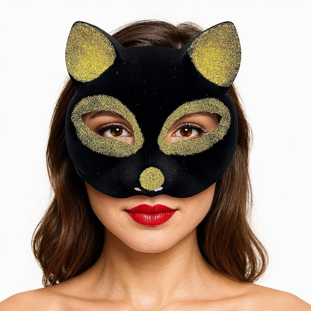 Siyah Renk Gold Simli Süet Kedi Maskesi ile sevimli ve eğlenceli bir görünüm oluşturun ve özel günlerinizi unutulmaz kılın