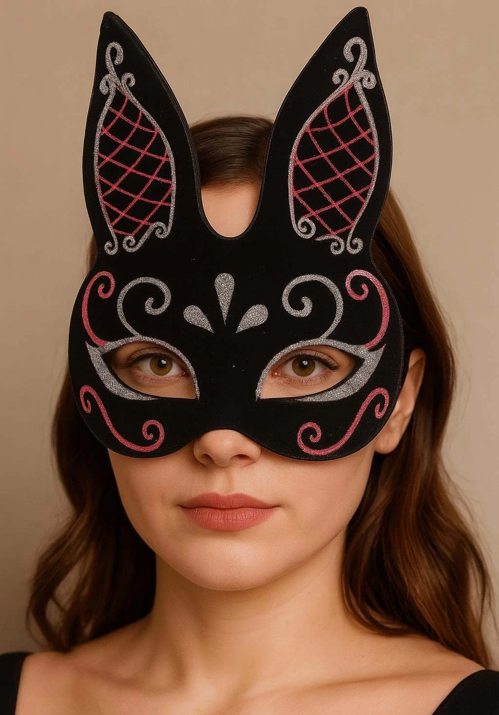 Bu siyah süet kaplama tavşan maskesi, kırmızı ve beyaz simlerle süslenmiş göz alıcı bir tasarıma sahiptir. 18x16 cm boyutlarındadır ve çoğu yetişkine uygundur.