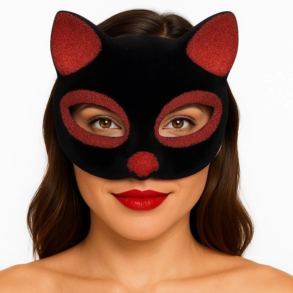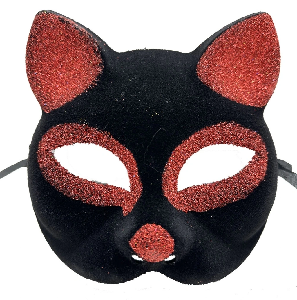 Siyah Renk Kırmızı Simli Süet Kedi Maskesi ile sevimli ve eğlenceli bir görünüm oluşturun ve özel günlerinizi unutulmaz kılın