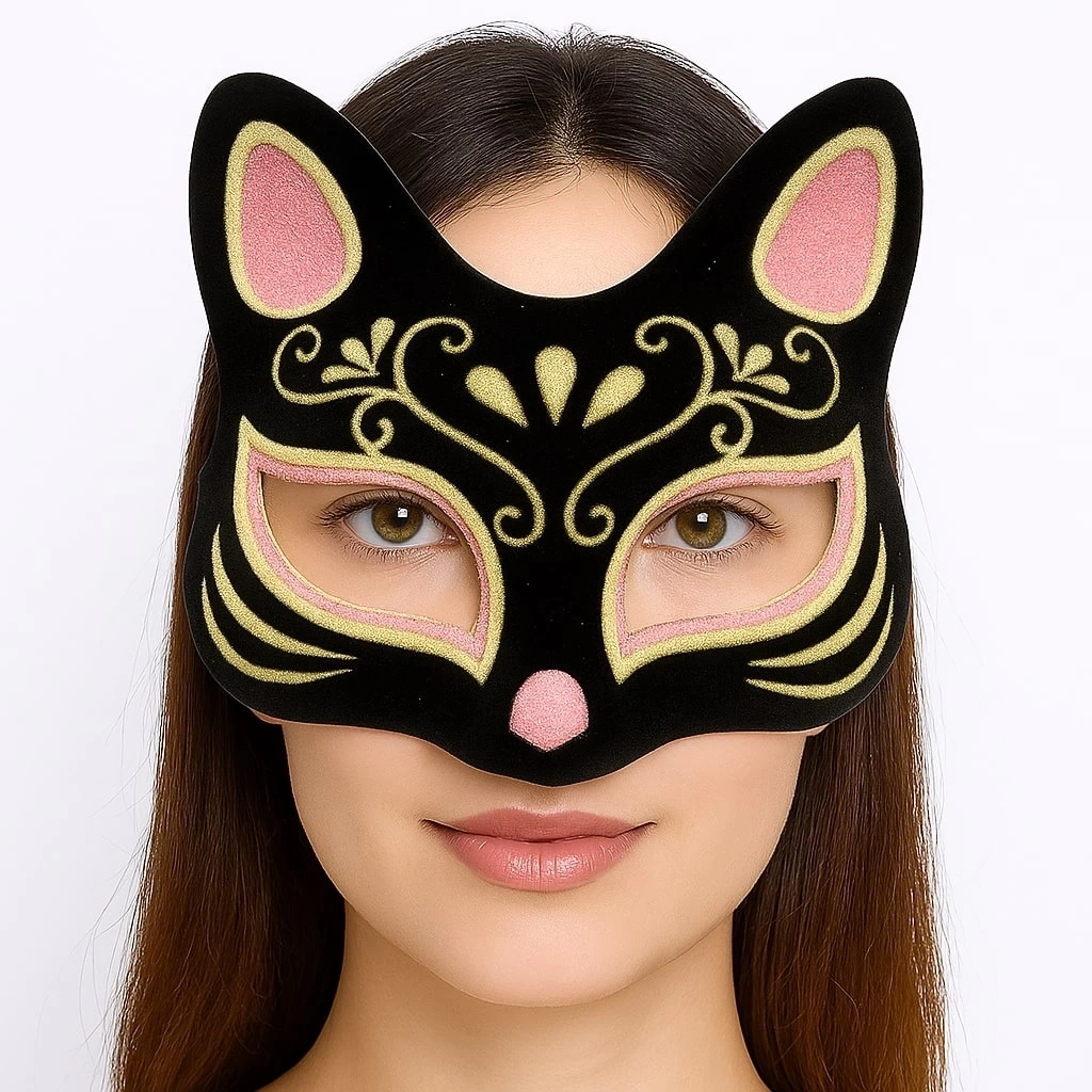 Siyah Renk Üzeri Pembe Sarı Simli Süet Kaplama Kedi Maskesi ile gizemli ve etkileyici bir görünüm oluşturun ve Kostüm Partisine hazır olun