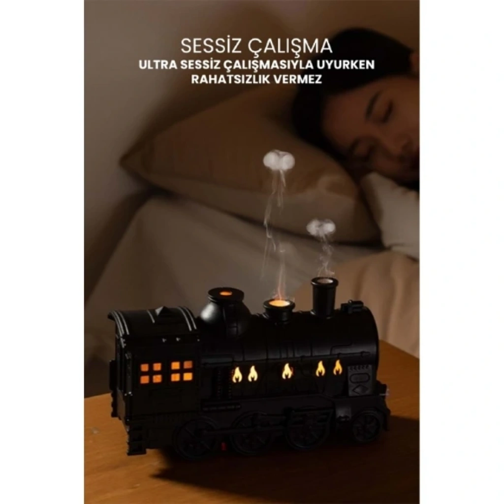 TREN GÖRÜNÜMLÜ HAVA NEMLENDİRİCİÜrün ÖzellikleriTren Görünümlü Hava Nemlendirici, benzersiz tasarımı ve güçlü performansı ile yaşam alanlarınıza hem estetik hem de fonksiyonel bir dokunuş katar. 350 ml su haznesi ile uzun süre kesintisiz nemlendirme sağlayan cihaz, sessiz çalışma teknolojisi sayesinde gece kullanımlarında bile rahatsızlık vermez. Tek buhar çıkış noktasıyla kontrollü ve dengeli bir nem dağılımı sunarken, alev efekti özelliği ortama dekoratif bir atmosfer kazandırır. 10–40 m² aralığındaki alanlarda etkili olan model, aromaterapi desteği sayesinde aroma yağlarıyla birlikte kullanılarak ferahlatıcı ve rahatlatıcı bir ortam oluşturur. Kumanda ile kolayca kontrol edilebilir ve 7 farklı LED aydınlatma modu ile ambiyansı kişiselleştirmenize imkân tanır. Tren görünümü, ürünü klasik nemlendiricilerden ayırarak hem yetişkinlere hem çocuklara hitap eden dekoratif bir aksesuar haline getirir. Aroma hediyesi ile birlikte gönderilmesi ise kullanım deneyimini daha da keyifli hâle getirir.Paket İçeriği1 Adet Tren Görünümlü Hava Nemlendirici 350 ml