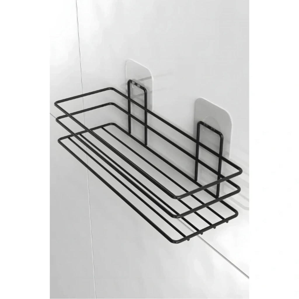 YAPIŞKANLI DUŞ VE BANYO RAFIÜrün ÖzellikleriYapışkanlı duş ve banyo rafı, banyoda delme işlemi yapmadan pratik bir şekilde düzen sağlamanıza yardımcı olur. Siyah kaplamalı paslanmaz metal malzemeden üretilmiş olup paslanmaya karşı dayanıklıdır ve uzun ömürlü kullanım sunar. Üç telli koruma kenarlığı sayesinde ürünleriniz düşmeden güvenle yerleştirilebilir. Açık taban tasarımı sayesinde su birikimini engeller ve hijyenik bir kullanım sunar. Şeffaf yapışkan panel ile banyonuza, duş alanınıza veya lavabo yanına kolayca monte edilir. Ortalama 3-5 kg taşıma kapasitesi ile şampuan, sabun, duş jeli ve benzeri ürünleri kolay erişilebilir biçimde organize edebilirsiniz. Modern görünümüyle banyo estetiğini bozmadan şık bir kullanım sunar. Aynı zamanda mutfakta veya diğer ıslak alanlarda da rahatlıkla kullanılabilir.Paket İçeriği1 Adet Yapışkanlı Duş ve Banyo Rafı