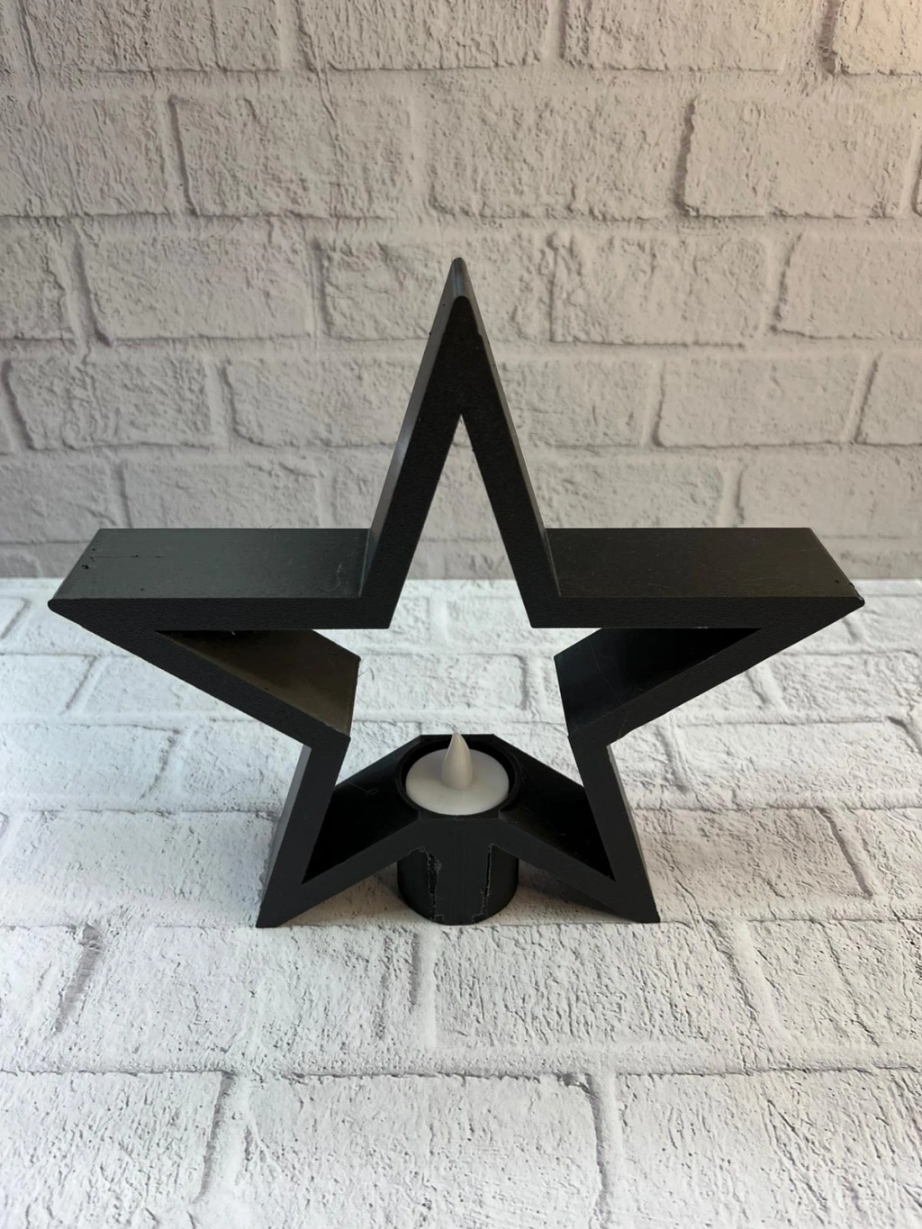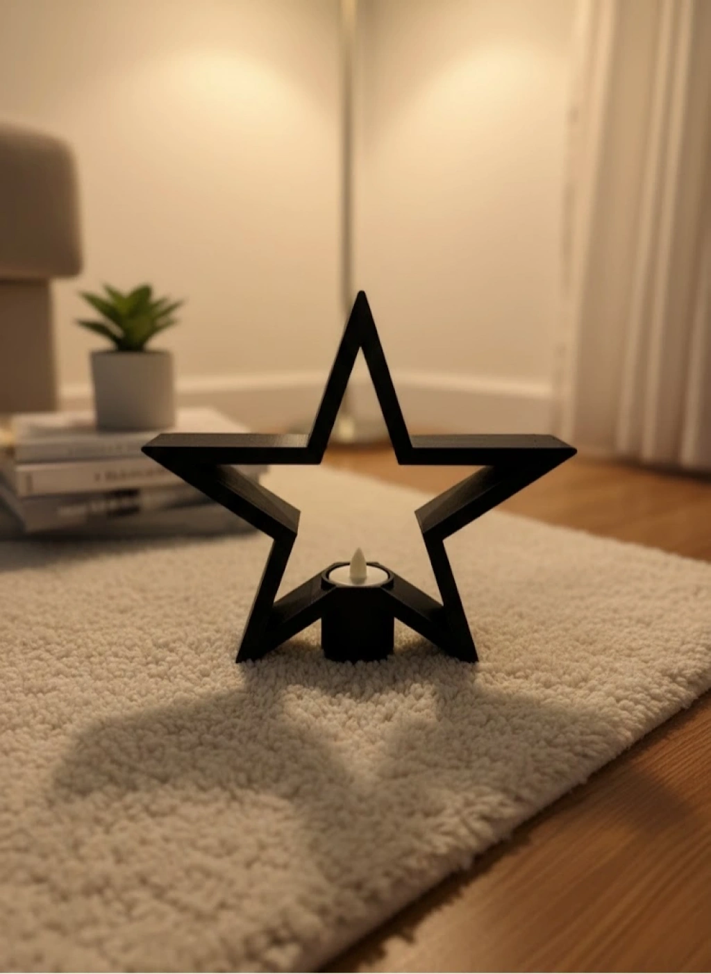 Siyah yıldız mumluk, sade tasarımıyla dekorasyonda güçlü bir etki yaratır. Raf üstü, masa veya köşe alanlarda tek başına kullanıldığında bile dikkat çekici bir görünüm sunar. Mum ışığıyla birleştiğinde sıcak, loş ve davetkâr bir salon ambiyansı oluşturur. Dekoratif ve işlevsel yapısıyla hem ev hem ofis kullanımı için uygundur.