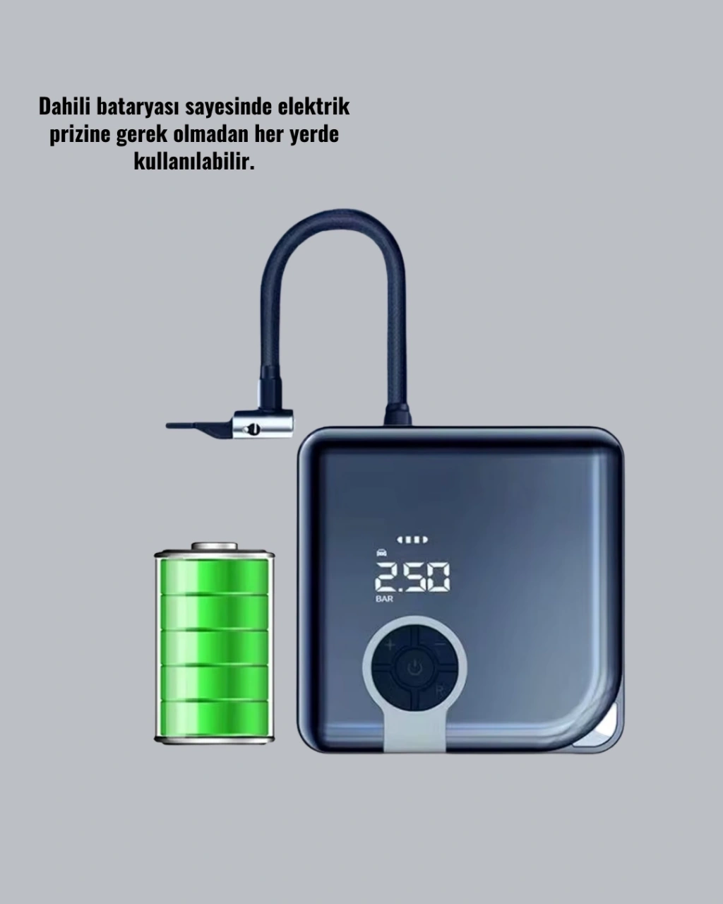 Taşınabilir kablosuz hava kompresörü, modern yaşamın ihtiyaçlarına uygun olarak tasarlanmıştır. Kompakt boyutu ve güçlü motoruyla lastiklerinizi hızlıca şişirir. 150 PSI kapasitesi ile otomobil, motosiklet, bisiklet ve şişme ürünler için güvenilir bir çözümdür.Dijital ekranı sayesinde basıncı hassas bir şekilde ölçebilir ve önceden ayarlayabilirsiniz. Cihaz ayarladığınız değere ulaştığında otomatik kapanarak güvenli bir kullanım sunar.6000 mAh bataryası güçlü ve uzun süreli kullanım sağlar. Tek şarjla dört lastiği şişirme kapasitesine sahiptir. Type-C girişli şarj özelliği sayesinde hızlı ve güvenli şarj imkanı sunar. SOS ışıkları ve LED aydınlatmaları sayesinde gece veya acil durumlarda ekstra güvenlik sağlar.Dayanıklı gövdesi uzun ömürlü kullanım için tasarlanmış olup, hafif yapısı sayesinde kolay taşınabilir. Şişme yataklar, kamp ürünleri ve spor topları için de kullanılabilmesi, bu ürünü çok yönlü hale getirir. Her araçta mutlaka bulunması gereken akıllı bir yardımcıdır.